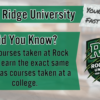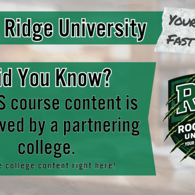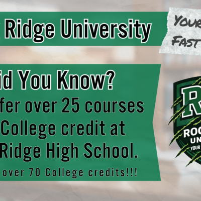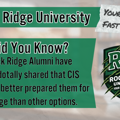 College in the Schools (CIS) classes are REAL COLLEGE CLASSES, which count for college credit that can be used towards earning a college degree or certification. They are taken right on the high school campus and taught by eligible and qualified Rock Ridge High School teachers. Students taking CIS also earn high school credit towards graduation on top of their college credit.